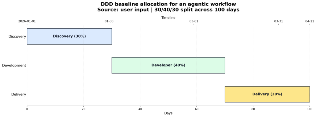 30 / 40 / 30Workflow + adoption centeredMost enterprise agentic workflowsRequires discipline to keep discovery outcome-drivenWhen done well: fewer surprises + faster adoption at scale