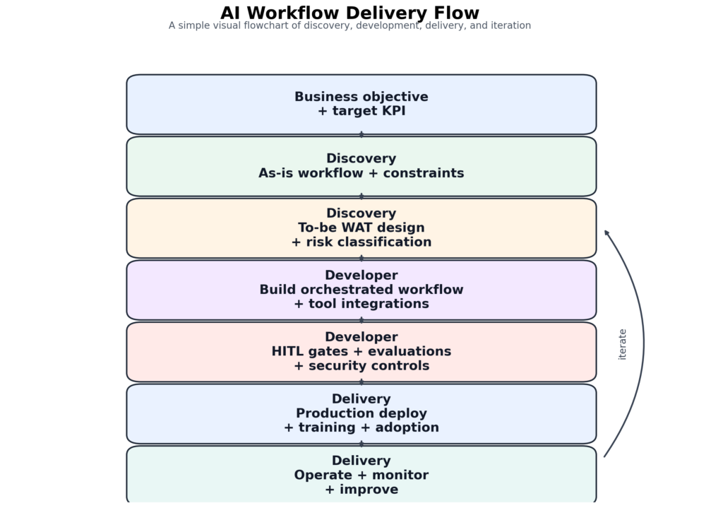 WAT designIdentify workflow boundaries; automation triggers; decision rights; tool inventoryTo-be process map; WAT component spec; tool access matrixAI Product Owner, Solution ArchitectSigned-off to-be workflow; tool access design reviewed