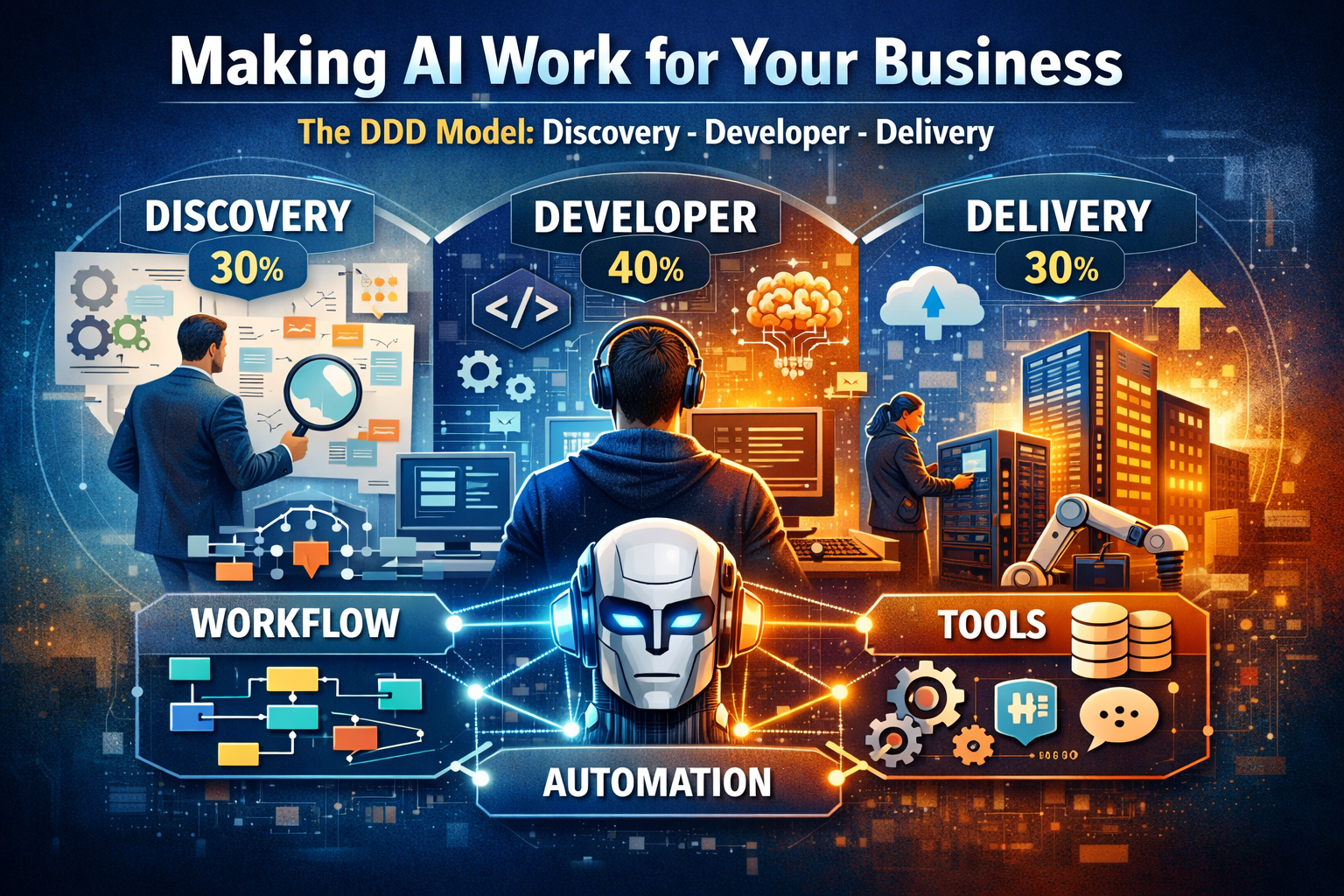 • DDD (Discovery, Developer, Delivery) defines how to implement WAT successfully: understand the real process and constraints, build the right automation and tool interactions, then operationalize it in production until it creates durable business outcomes.